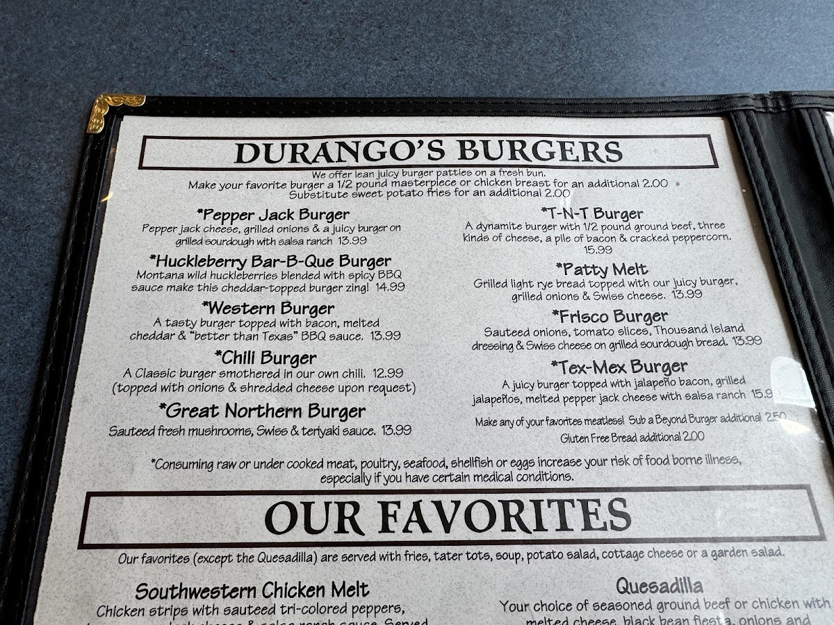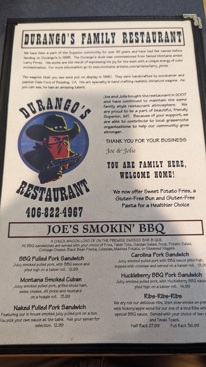 Welcome to Durango's, a culinary gem located in the heart of Superior, MT. This charming spot offers a menu that expertly bridges the gap between comfort food and delightful creative twists. Start your day with hearty options like The Trapper—thick French toast paired with eggs and your choice of savory meats, or the Belgian Waffle with classic accompaniments. For an unforgettable dinner, try The Comstock, a 2/3 lb beef steak smothered in rich gravy, or savor the succulent Fried Chicken.